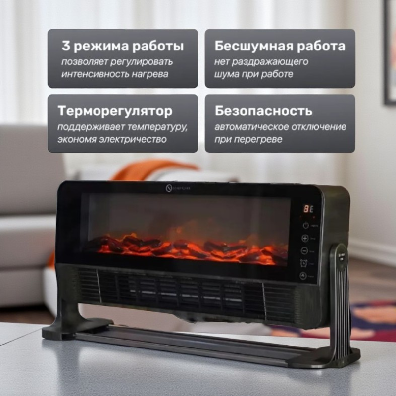 В основе работы камина лежит современный керамический нагревательный элемент, который быстро и равномерно распределяет тепло. Благодаря трём режимам работы вы можете легко регулировать интенсивность нагрева, а встроенный терморегулятор будет автоматически поддерживать заданную температуру, экономя электроэнергию. Управление осуществляется через интуитивно понятную сенсорную панель с дисплеем или с помощью пульта ДУ. Для вашей безопасности предусмотрена система автоматического отключения при перегреве, а бесшумная работа не будет отвлекать вас от отдыха.